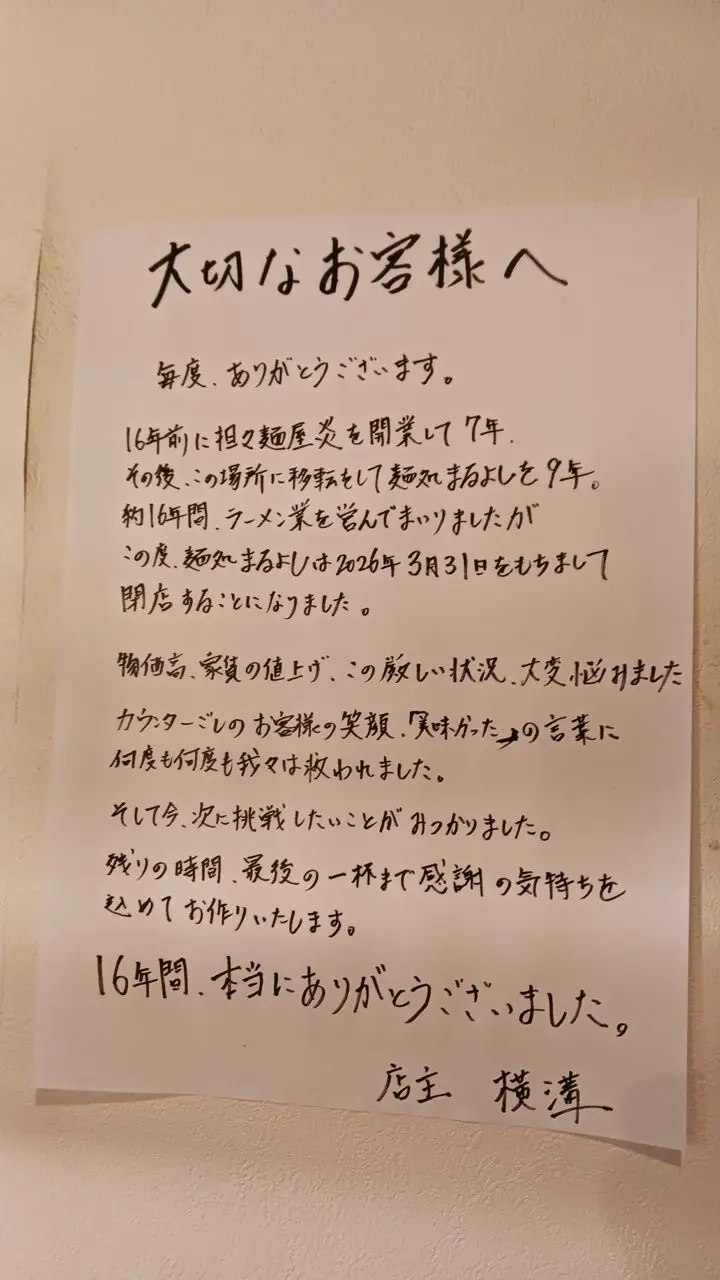 店主によると、約16年前に担々麺専門店「炎」を開業し、その後移転して「麺処まるよし」として営業。合わせておよそ16年間にわたりラーメン店を営んできたとのことです。